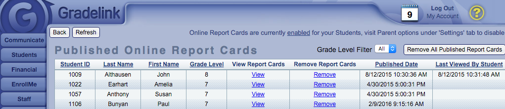 2. Click the “View Published Report Cards” button to see a list of all students that currently have a report available for download. You can see which report cards are published online and who saw them last.
