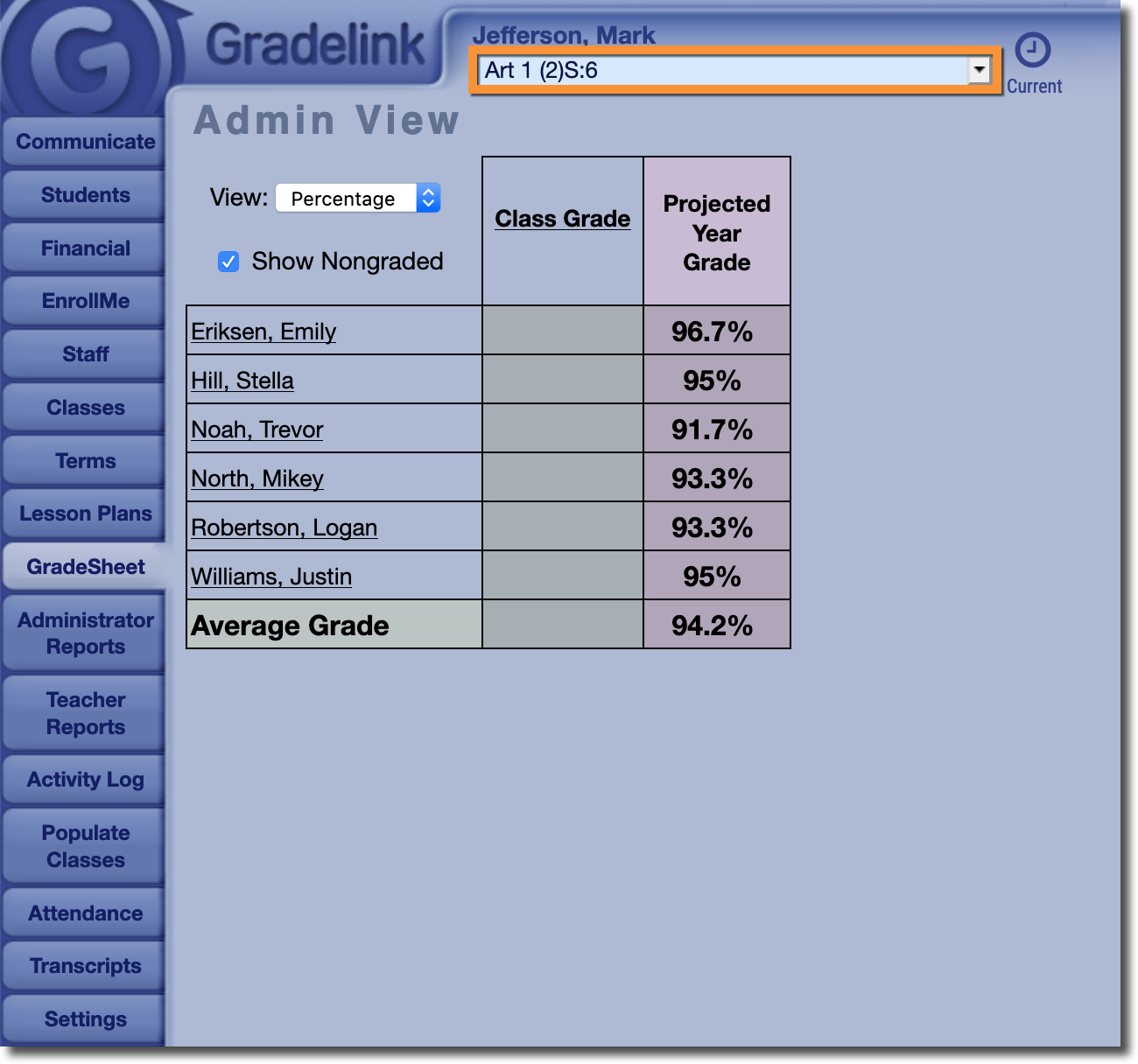 If an Administrator only wants to view the grade sheet, they can do so by going to the GradeSheet tab and selecting the appropriate class from the drop-down menu at the top of the page.