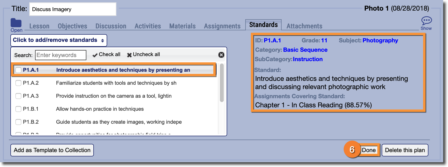 6. When you're all done adding Standards, click Done.