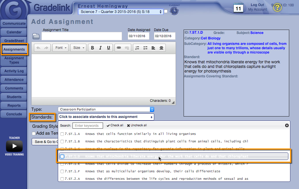 Notice, hovering over a standard shows details about the standard on the upper right.