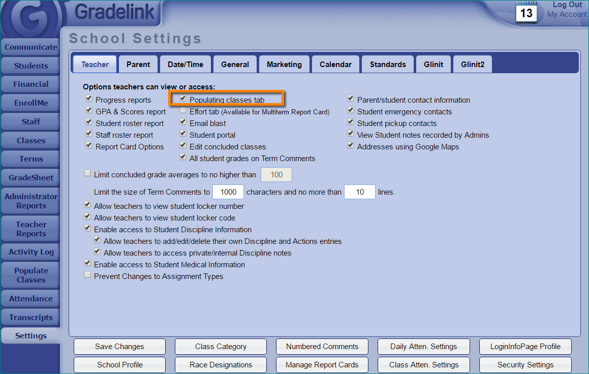 1. As an Administrator, click the Settings tab then the Teacher sub tab