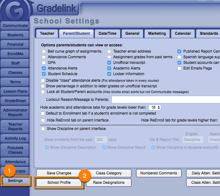 Gradelink automatically pulls information from the School Profile and displays it on student transcripts.