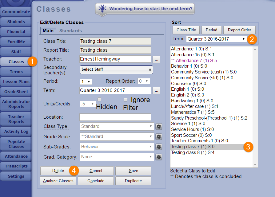 Note: If the class has students with grades you will need to save the grades before deleting the class. You can do this by printing the GradeSheet.