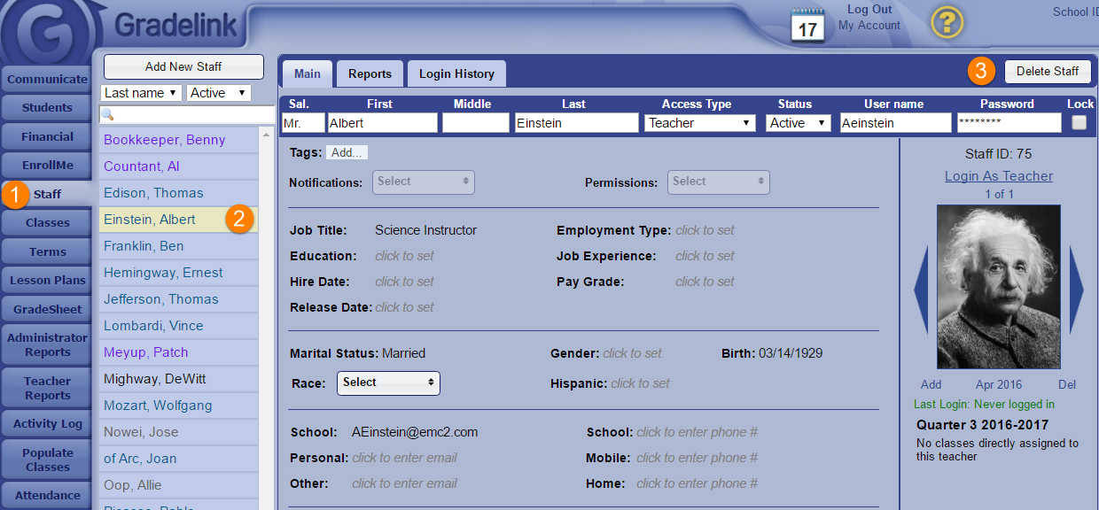 Note: If you try to delete a staff account that still has classes assigned to it, the account will instead be made "Inactive". This is a security feature to prevent accidental deletion of data.