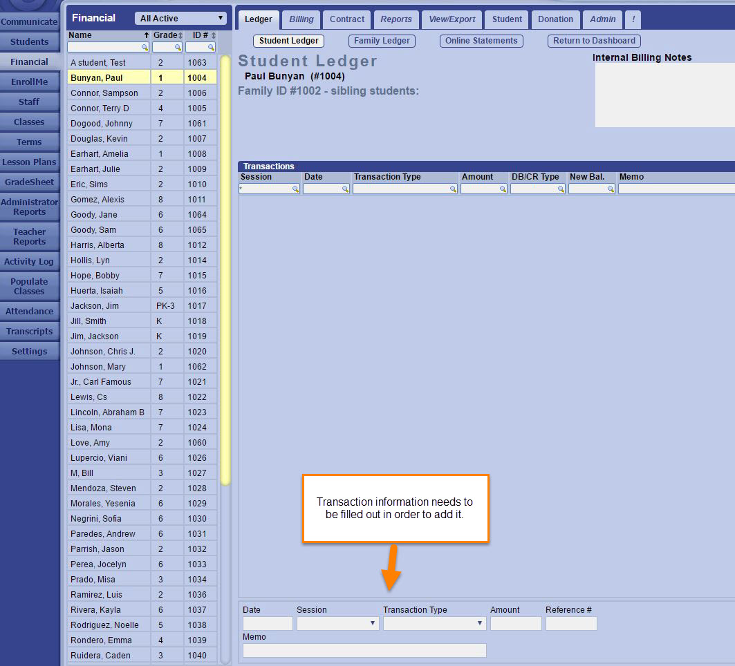 4. Enter in the date, session, transaction type, amount, payment method, and reference # (Charges don’t require a payment method or reference #). Any notes entered in the “memo” box will appear directly on the statement.