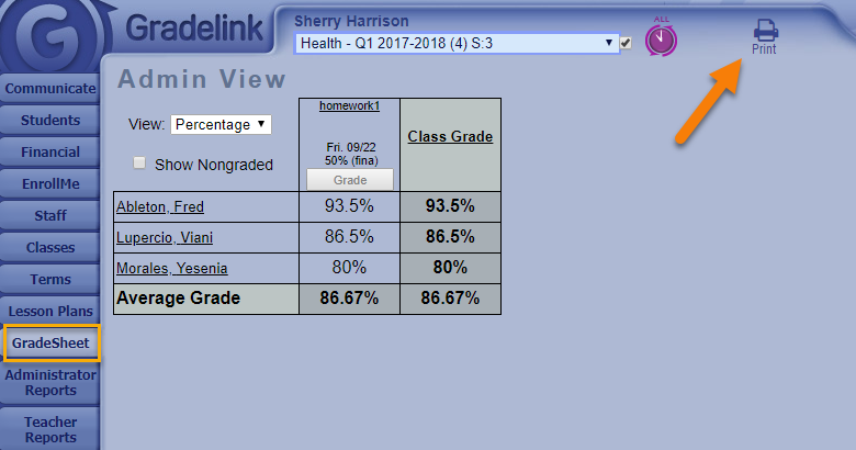 1. Click the Printer icon on top of your GradeSheet.