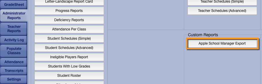 Once we enable the data export tool, you should see a new option in the Administrator Reports tab called "Apple School Manager Export".