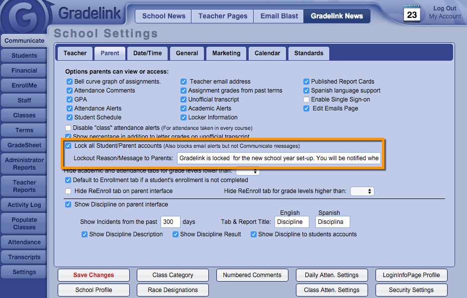 - Check the check box labeled "Lock all Student/Parent accounts"