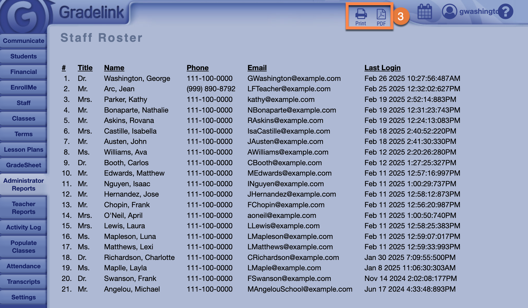 How do I print out a staff roster? How do I print out a staff roster? Possible Scenario:1. How do I print out a staff roster?2. Where is the roster report located?Solution:Follow steps below: Click on the Administrator Reports tab Click on Staff Roster Click on Print or PDF