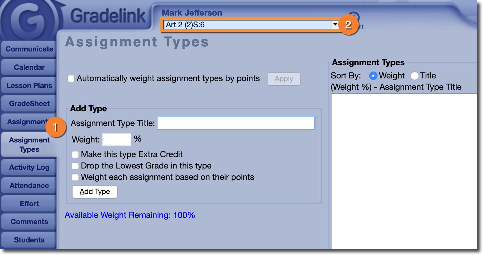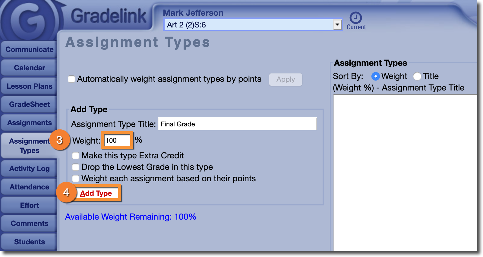 3. Create a new Assignment type and make sure to set the weight to 100%.