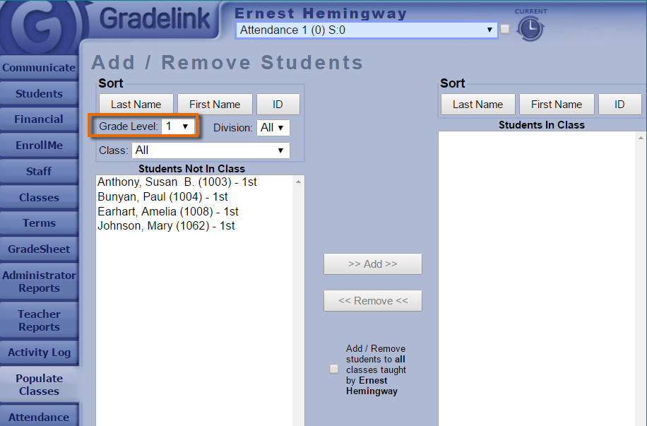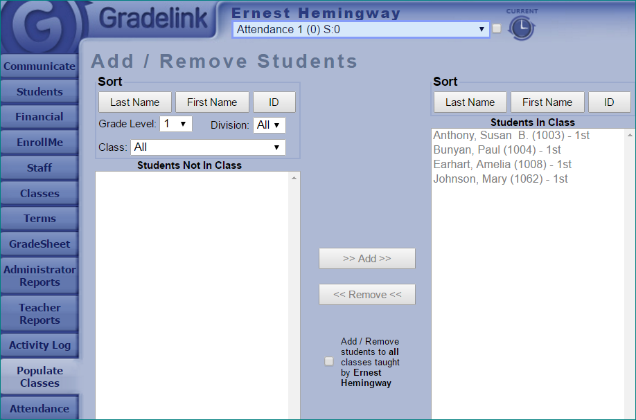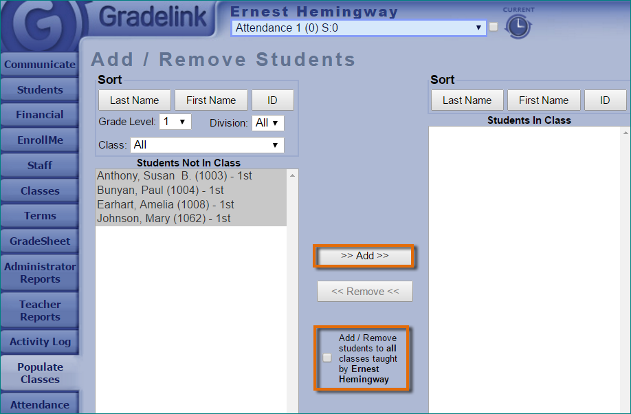 From the drop-down menu at the top of the screen, select the class (subject) you wish to populate. In the list on the left*, select the student(s) you wish to add to the class. This is the list of students who are not in the class. The list on the right is the list of students who are in the class.