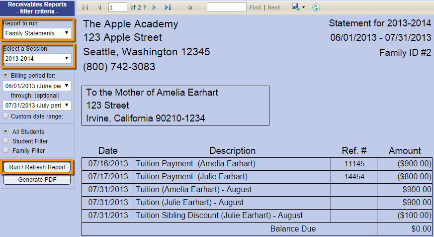 Family statements (statements with multiple students). You will need to link students of the same family together using a “Family ID” to take advantage of this feature. Family statements present the Family ID in the upper right corner instead of a single student name and the student names are presented parenthetically in the line item descriptions. If the filter criteria is set to a single student then Family Statements will still generate for that student’s family including all siblings. If the filter criteria is set to all students then Family Statements will generate one statement per family as well as individual student statements for any students that do not have a family ID. In this case the single-student invoices will appear in exactly the same as the regular (Student) Statements with the student names in the upper right hand corner in place of Family ID.
