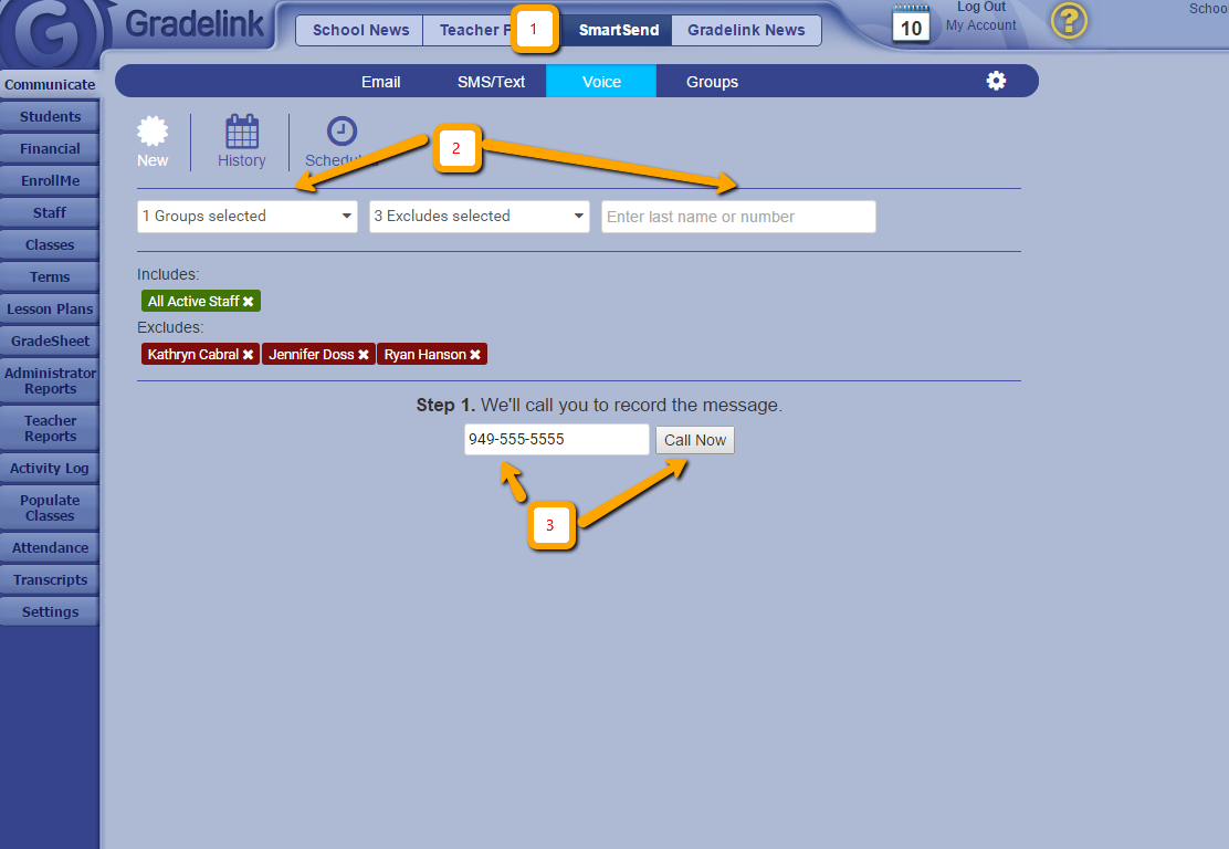 3. To record your actual message, you’ll need to enter your phone number into Gradelink and hit “Call Now”. An automated phone call from Gradelink will then ask you to record your message, and once you’re done you can hang up to send it directly to your browser. If you aren’t satisfied with the recording, you can hit the “Start Over” button to restart the process. Otherwise, you can either send your Voice message immediately or Schedule it for a later date.