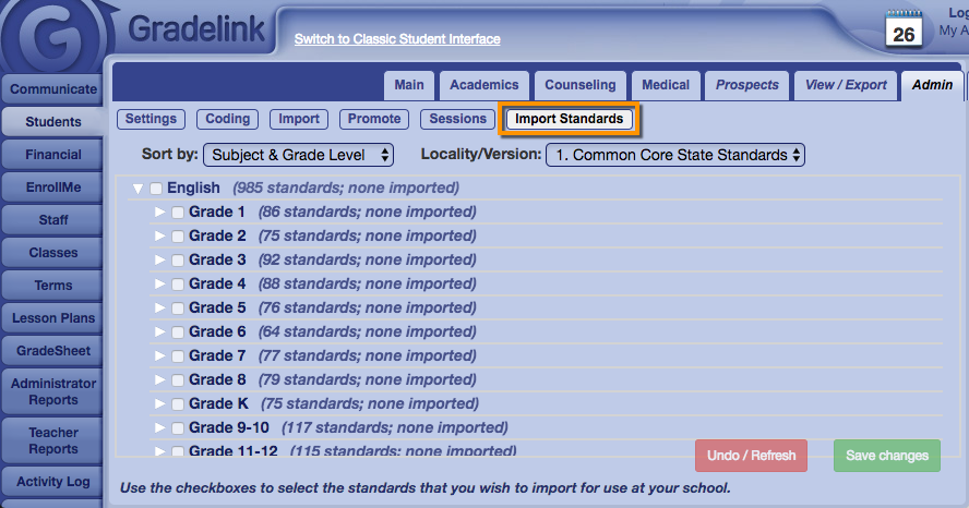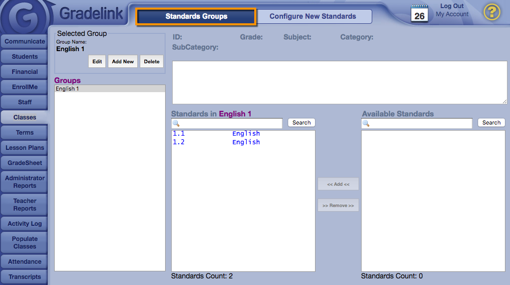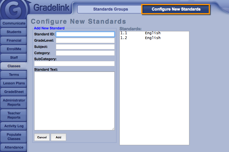 2. Then the admin starts making “groups” of standards related to classes, and either import to these groups from Gradelink’s standards library, or manually enter their own standards.