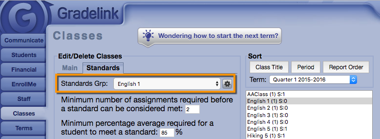 3. On the Classes tab, admins associate each “group” of standards with each class.