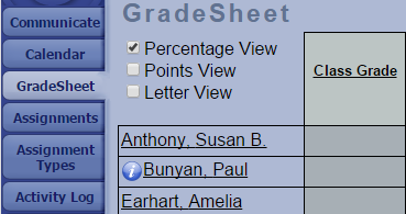 Note: If a student is not marked “present” for the day, a blue icon will appear on the grade-sheet next to the student’s name (as shown in the image below). If you roll-over their name, a little pop-up will display their attendance info.