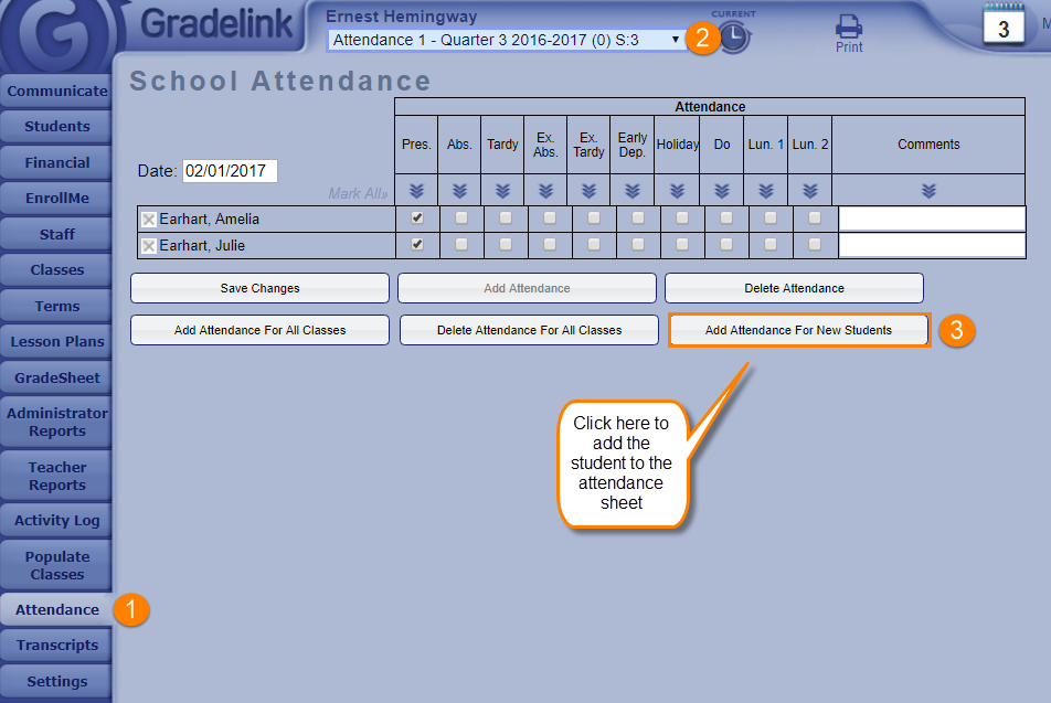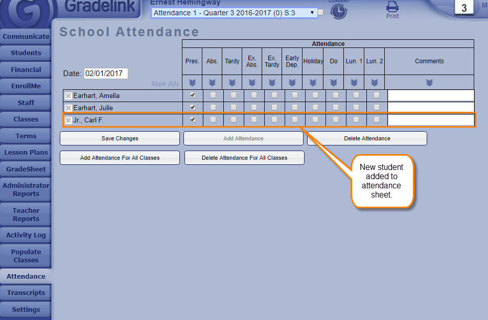 I just added a new student to the attendance class and he or she is not showing, what am I doing wrong?