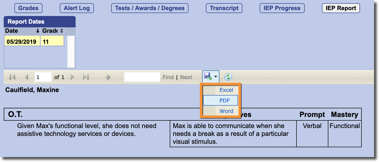 If you would like to export the report, you can do so by clicking on the floppy disk icon near the top of the report. Gradelink can export the IEP Report as an Excel spreadsheet, as a PDF, or as a Word document.