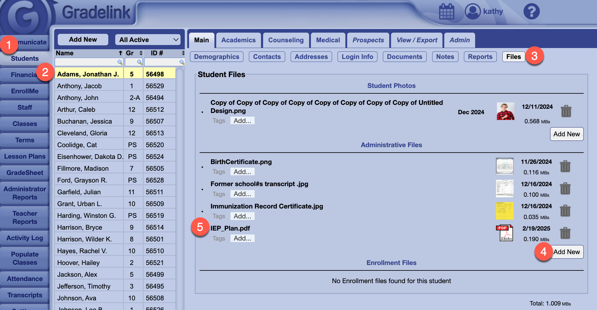- Click on the gray Add New button in Administrative Files to access saved IEP/504 documents to add to student's profile