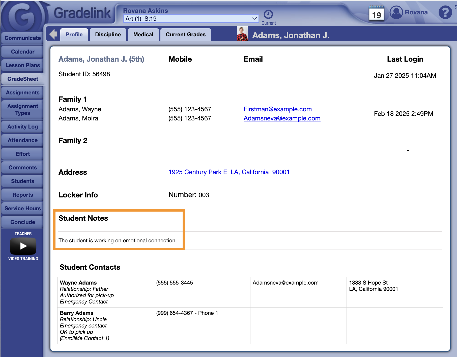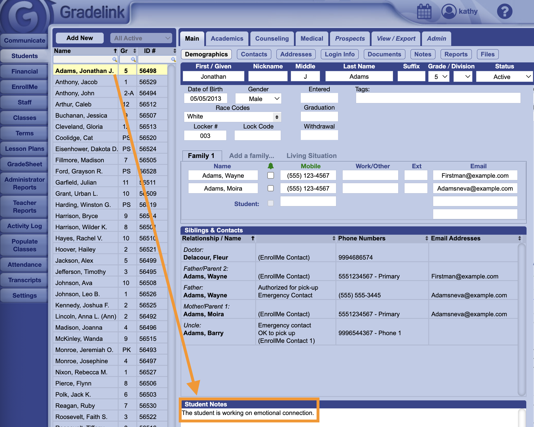 Teachers can access the Student notes for any student they teach by clicking on the student's name in the GradeSheet, thus allowing the teacher to view the notes as part of the student's emergency card.