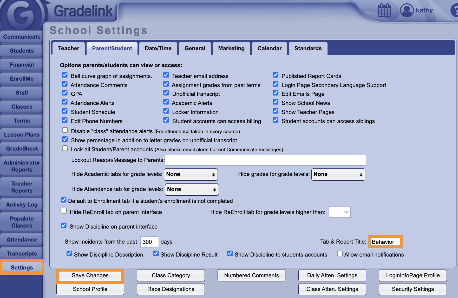 Schools can choose to rename the Discipline tab to a meaningful name like "Observations" "Incidents", or "Behavior". This change can be made by clicking on the Settings tab in the left sidebar, entering a different name in the field next to "Tab & Report Title", then clicking on the Save Changes button.