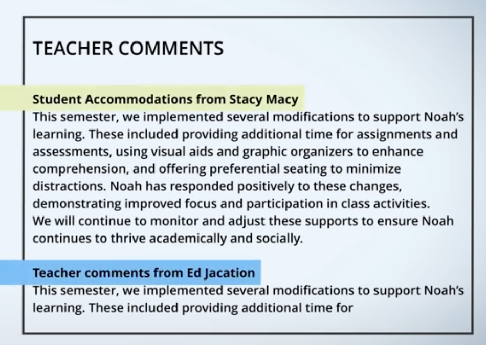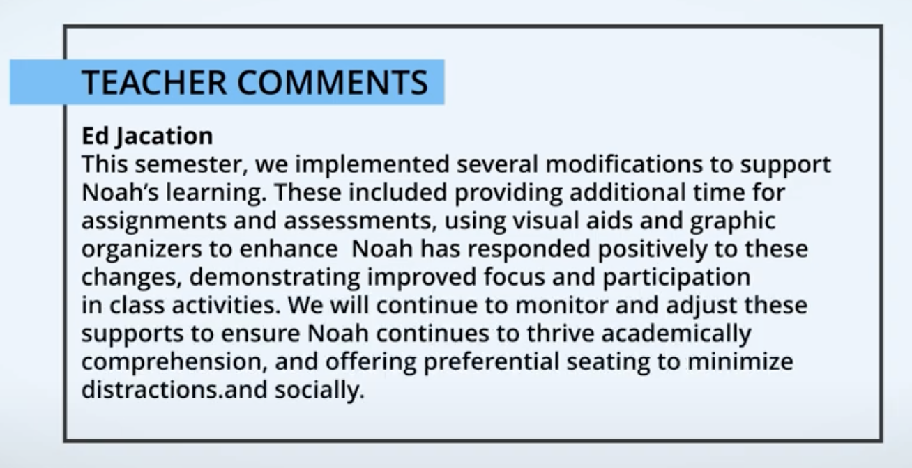 You can also utilize the teacher's comment box to document accommodations provided to the student or create a separate teacher's comment box specifically for accommodations.