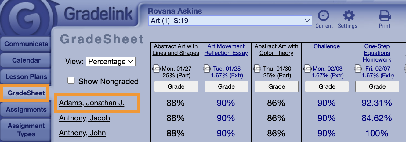 - Highlight the student's name in the list of students
