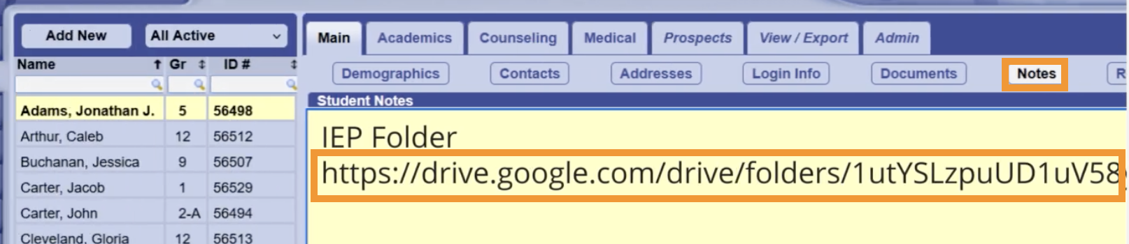 Student Notes is a great way to share IEP and 504 plan information with a student's teachers. Only administrators can add information to the student's notes.