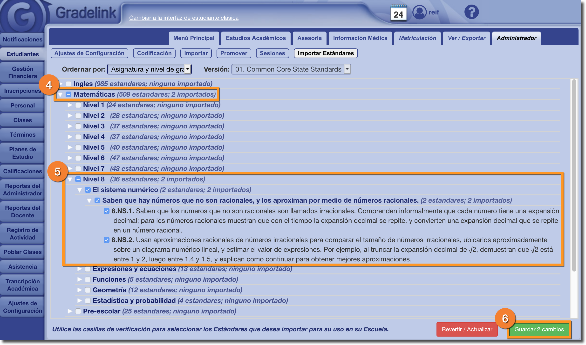 4. Haga clic en el nombre de la materia principal (por ejemplo Matemáticas) para expandir o contraer la biblioteca de estándares que desea importar para esa clase o materia.