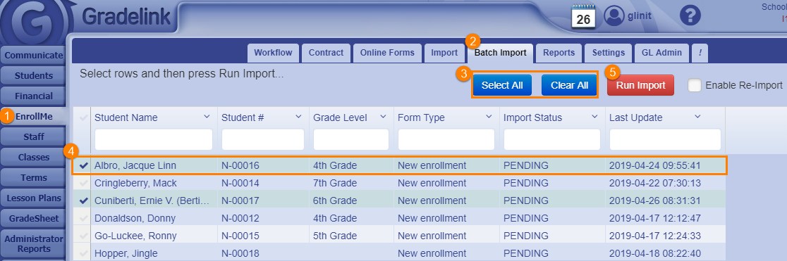 Note: If a student needs to be Re-Imported (for example, if changes have been made to their application AFTER importing them), click the Enable Re-Import check box next to the Run Import button. This will cause already-imported students to display below.