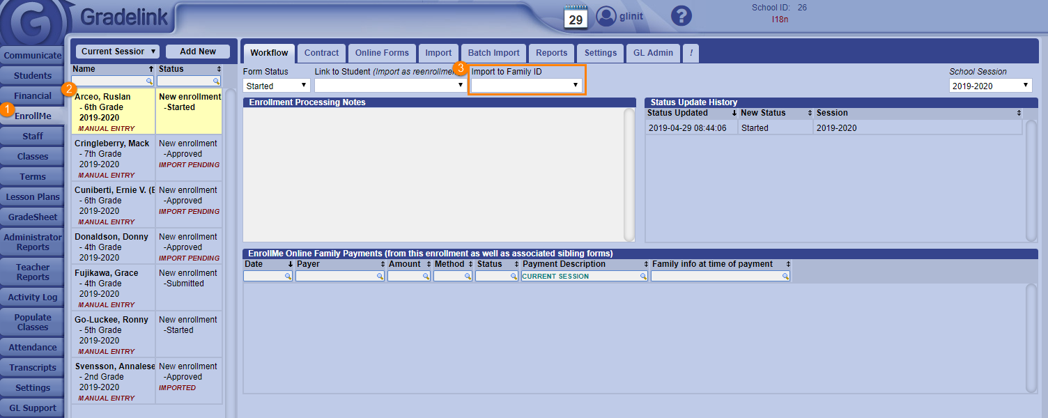 If a brand new student already has siblings enrolled in the school, you can link the new enrollment's application to the existing family ID associated with their siblings: