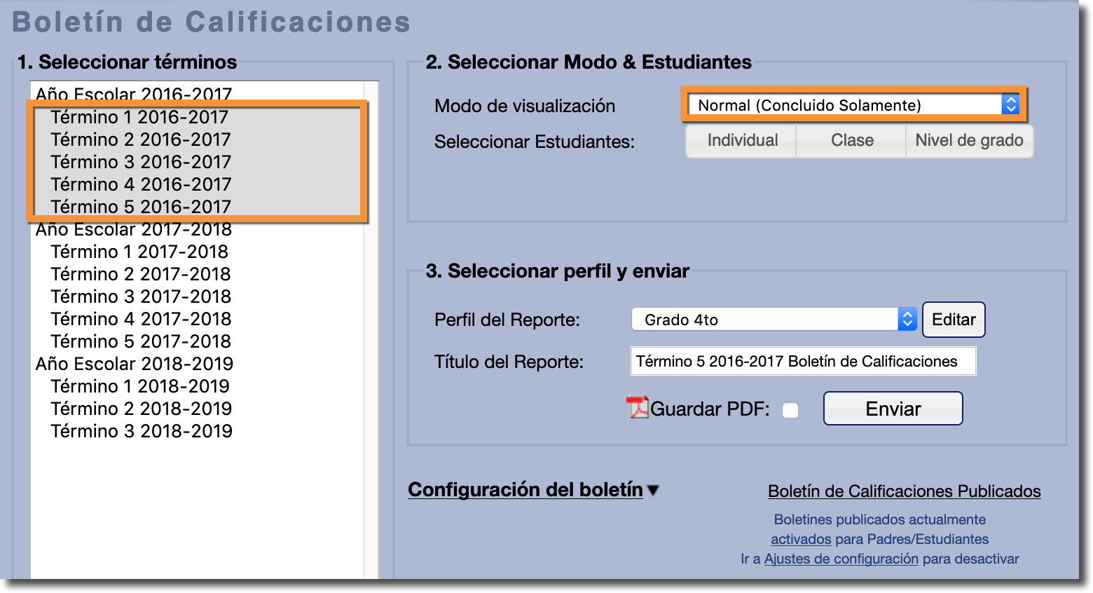 Simplemente puede seleccionar los términos apropiados de la lista de la izquierda y luego ejecutar el boletín de calificaciones de manera normal.