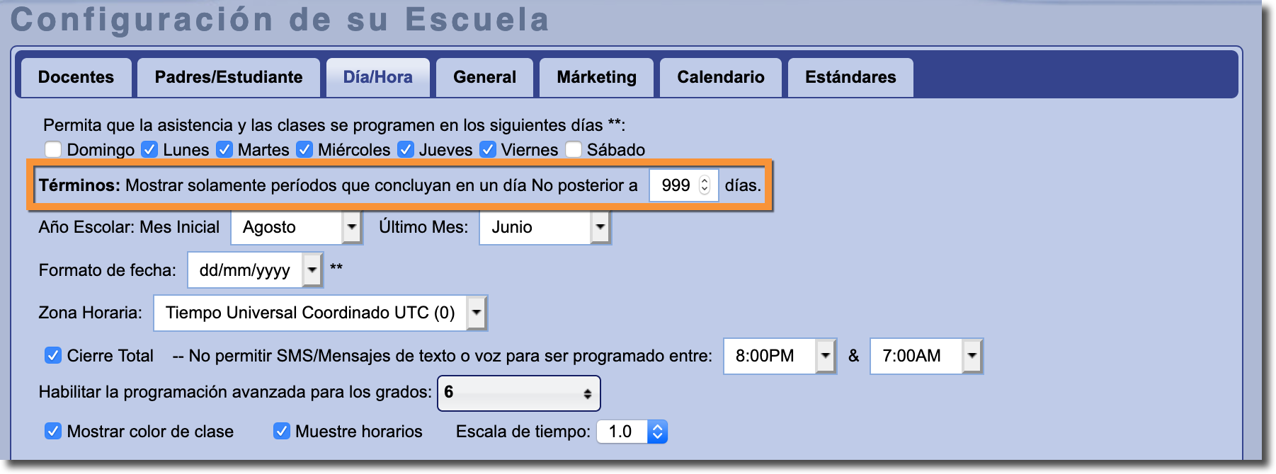 Si no ve los términos que desea, la razón más probable es que ha transcurrido demasiado tiempo desde sus fechas de finalización y que se han ocultado. Para resolver este problema, deberá aumentar la cantidad de días que deben pasar antes de que se oculte un término. Para ello, vaya a la sección Día / Hora de la pestaña Ajustes de Configuración.