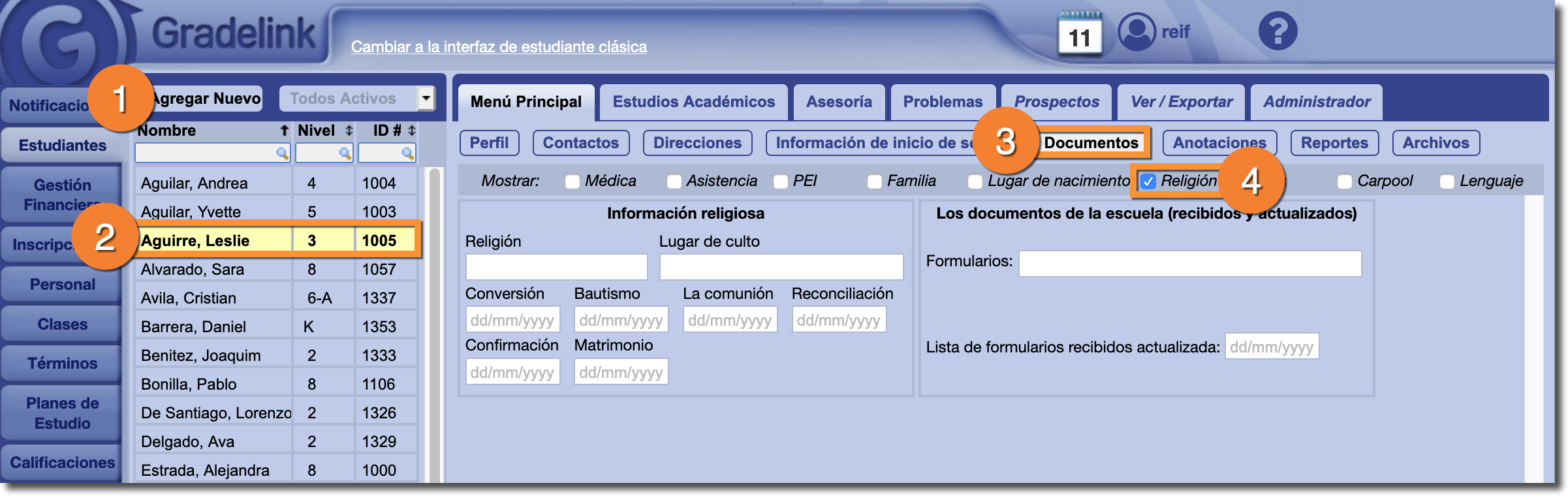 Utilizando la página de Documentos, los Administradores pueden registrar información religiosa para sus estudiantes.