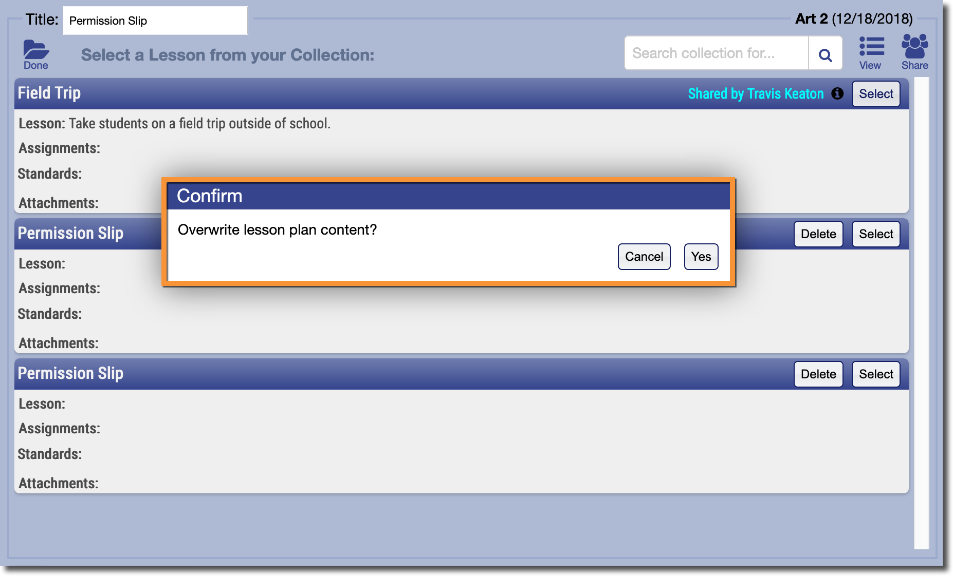 To use a template from your Collection, just click the "Select" button on the right. Gradelink will ask you to confirm that you'd like the template to overwrite any existing information in the lesson plan.