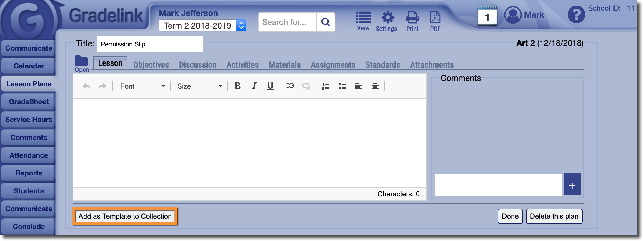 The Lesson Plan Collection allows Teachers to create reusable templates to speed up the process of creating lesson plans. Additionally, the Lesson Plan Collection allows Teachers to collaborate by sharing their templates with other Teachers. If you would like more information about sharing lesson plan Collections, please click here.
