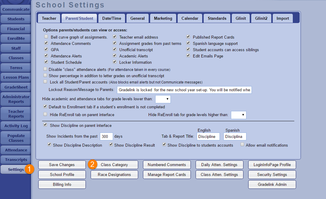 Administrators can make changes to the name and grade codes used for Effort / the Class Category by using the Settings tab.