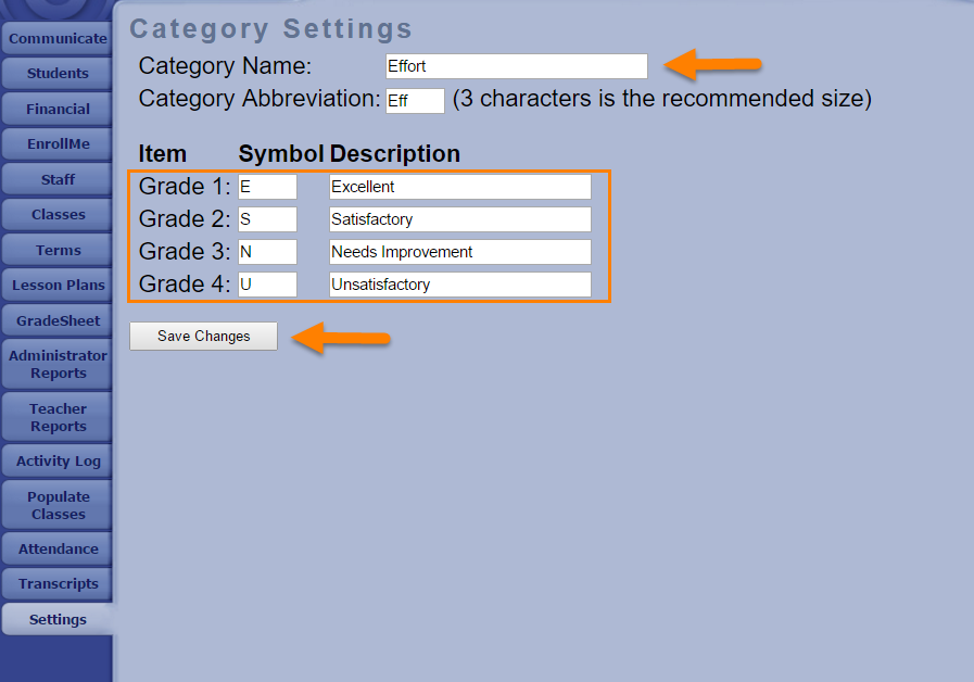 In the Category Settings page, you can make changes to the title of the class category (the default title is "Effort") as well as the grade codes that will be available to teachers. Don't forget to click Save Changes to complete the process.