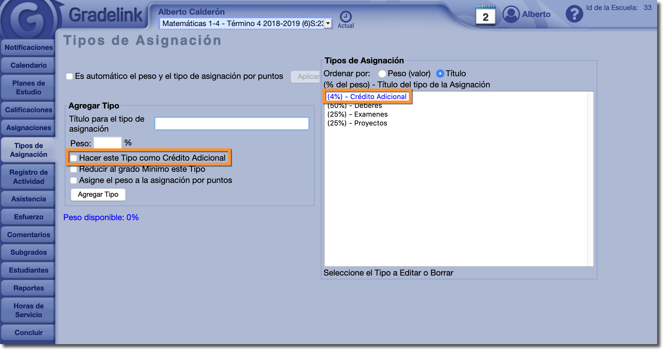 Las asignaciones con tipo crédito adicional son un beneficio para el estudiante si califican algo en absoluto. El crédito extra nunca daña la calificación del estudiante. Los Tipos de Asignación de Créditos Extra cuentan más allá del 100% que conforma la clase. En el siguiente ejemplo, un tipo de asignación llamado "Trabajo de bonificación" tiene crédito adicional habilitado y tiene un peso del 5%. 105% es posible en la clase. Si se ofrece una asignación de crédito adicional, y un estudiante recibe el 40% en esa tarea, ese estudiante recibirá 2 puntos porcentuales (o el 40% del 5%) que se agregará a su calificación final.