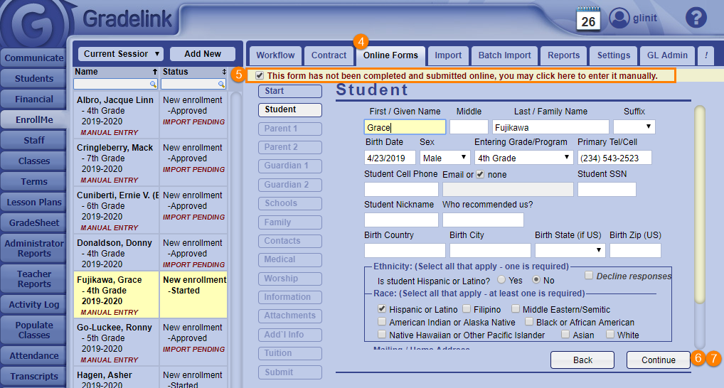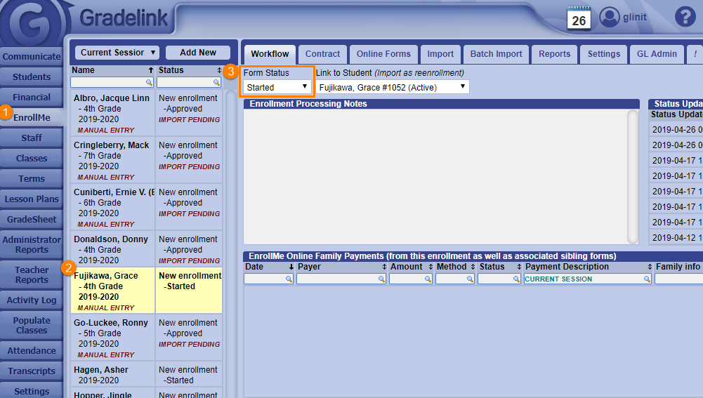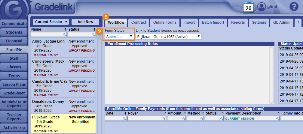 At this point, you can either set another form status to the application or change it to Approved in order to import the information from the application into Gradelink.