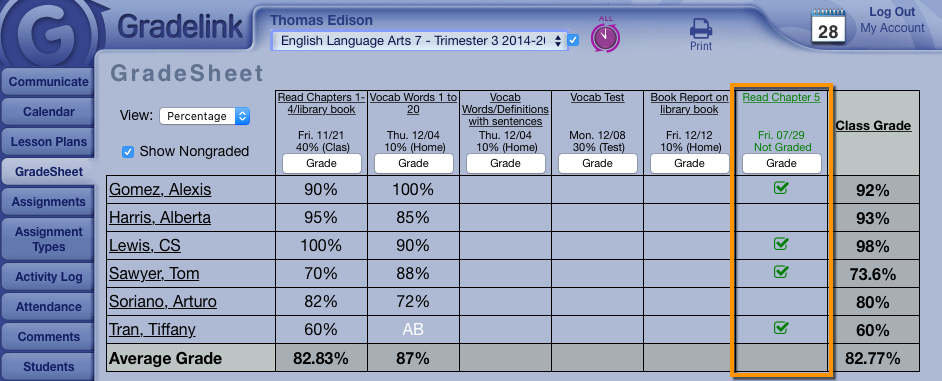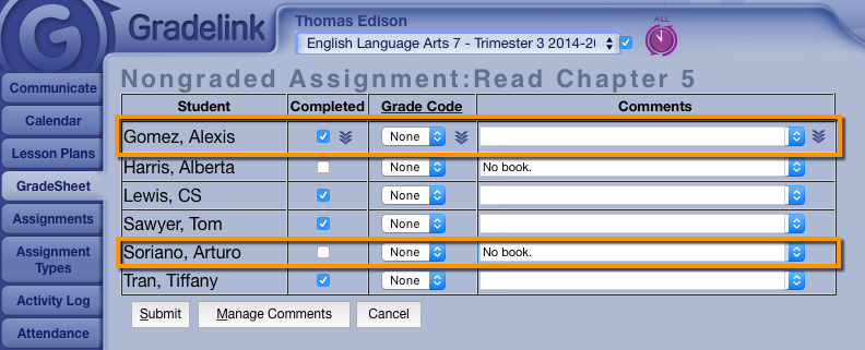 3. Teachers can optionally mark these as completed, or apply a Grade Code.