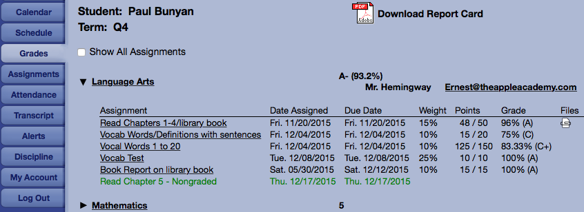 On the Student/Parent interface, any non-graded assignments will appear in green, with no weight or grade associated.