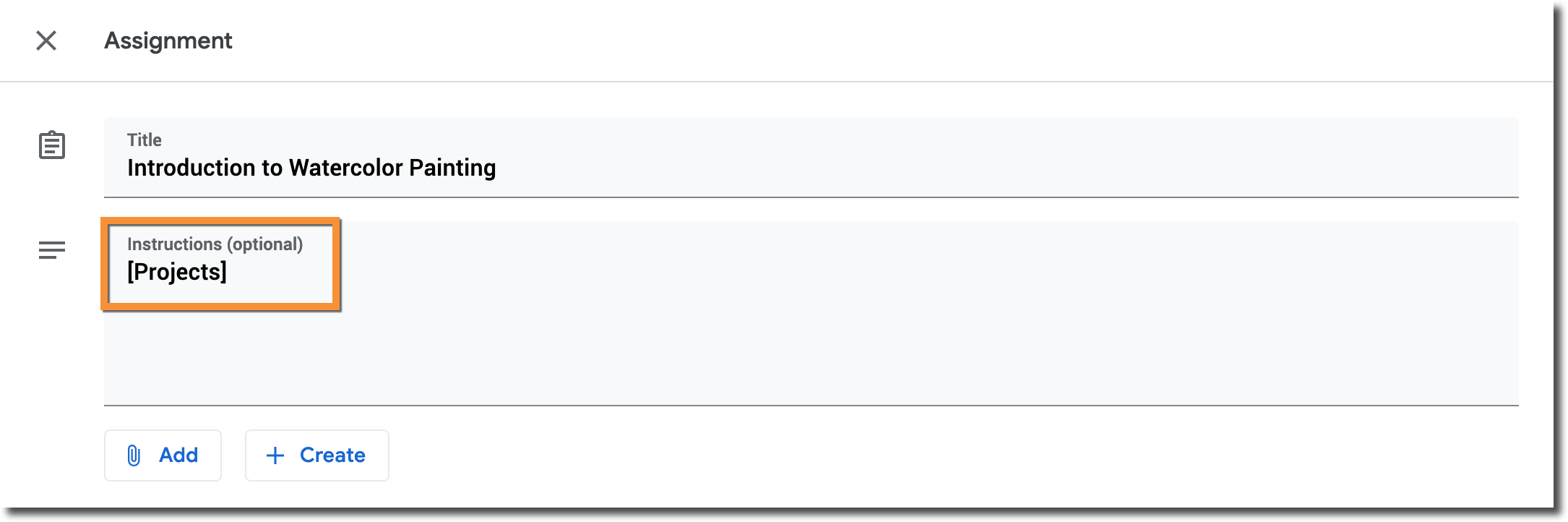 For example, if the Assignment Type that I wanted to use was "Projects", then I would enter "[Projects]" in the Instructions field in Google Classroom