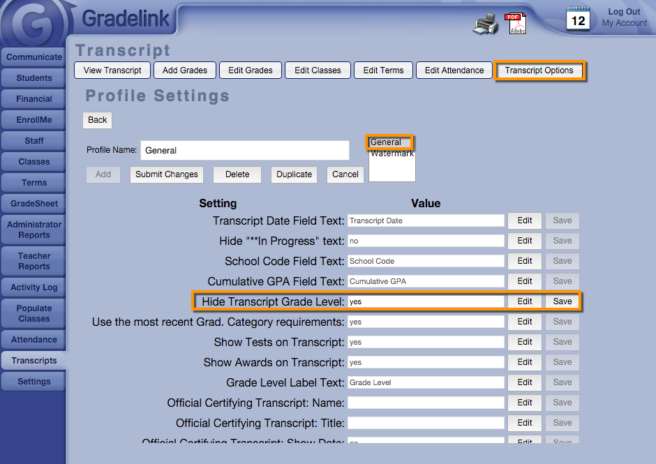 - Haga clic en el botón Editar a la derecha de "Ocultar nivel de grado de la transcripción" e ingrese "sí" con letras minúsculas.