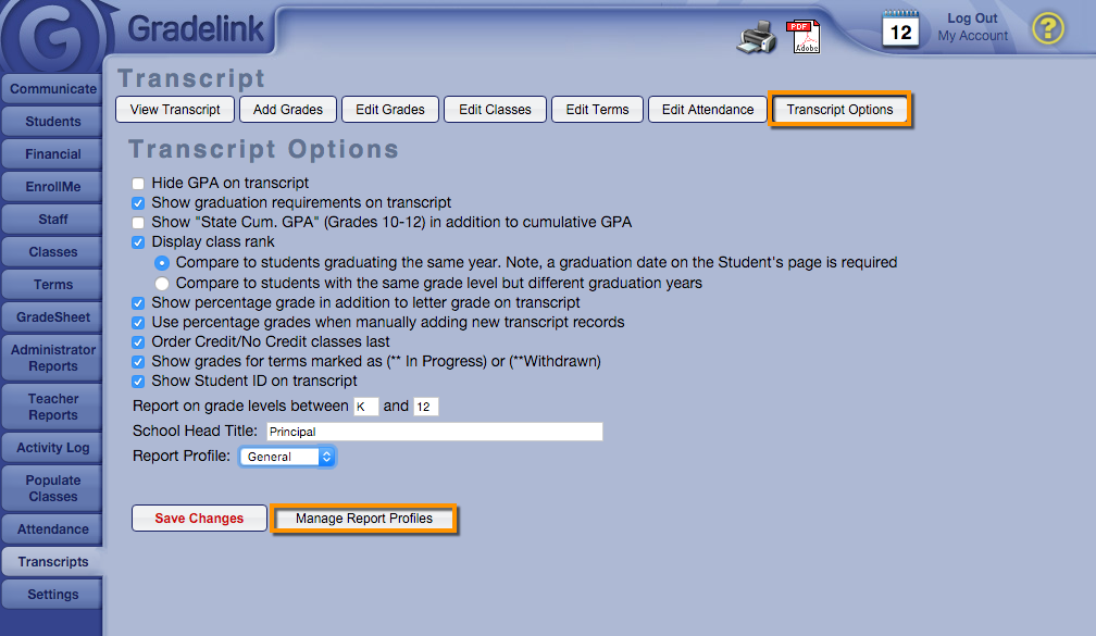 Los perfiles de informe permiten a la escuela guardar diferentes configuraciones y cambiar fácilmente entre ellas. La mayoría de las escuelas tienen un solo perfil, y generalmente contiene su marca de agua.