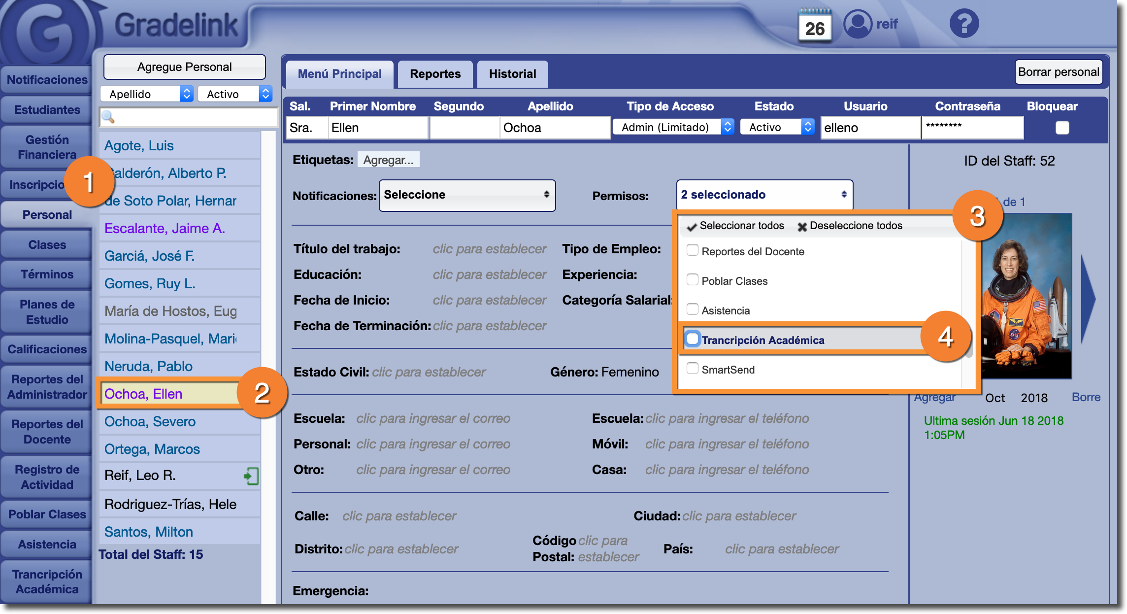 Los administradores ilimitados pueden otorgar a los administradores limitados la capacidad de ejecutar transcripciones modificando sus 'permisos' en la pestaña Personal:
