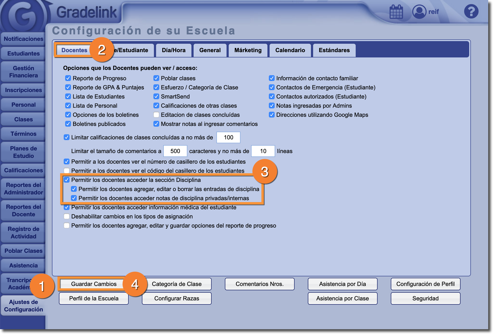 Gradelink les brinda a los administradores la capacidad de permitir que los docentes accedan a los registros de disciplina de la escuela para cualquier estudiante que enseñen. Además, los administradores pueden permitir que los docentes agreguen, editen y eliminen entradas de disciplina y tengan acceso a las notas internas registradas por otros miembros del personal.