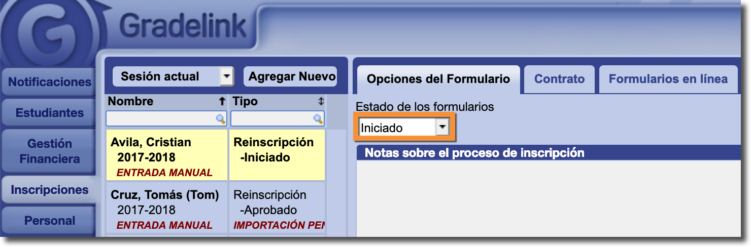 Una solicitud no puede ser cambiada una vez que ha sido enviada. Si usted o un estudiante / padre desea cambiar su información, deberá cambiar el estado del formulario de "Enviado" a "Iniciado":