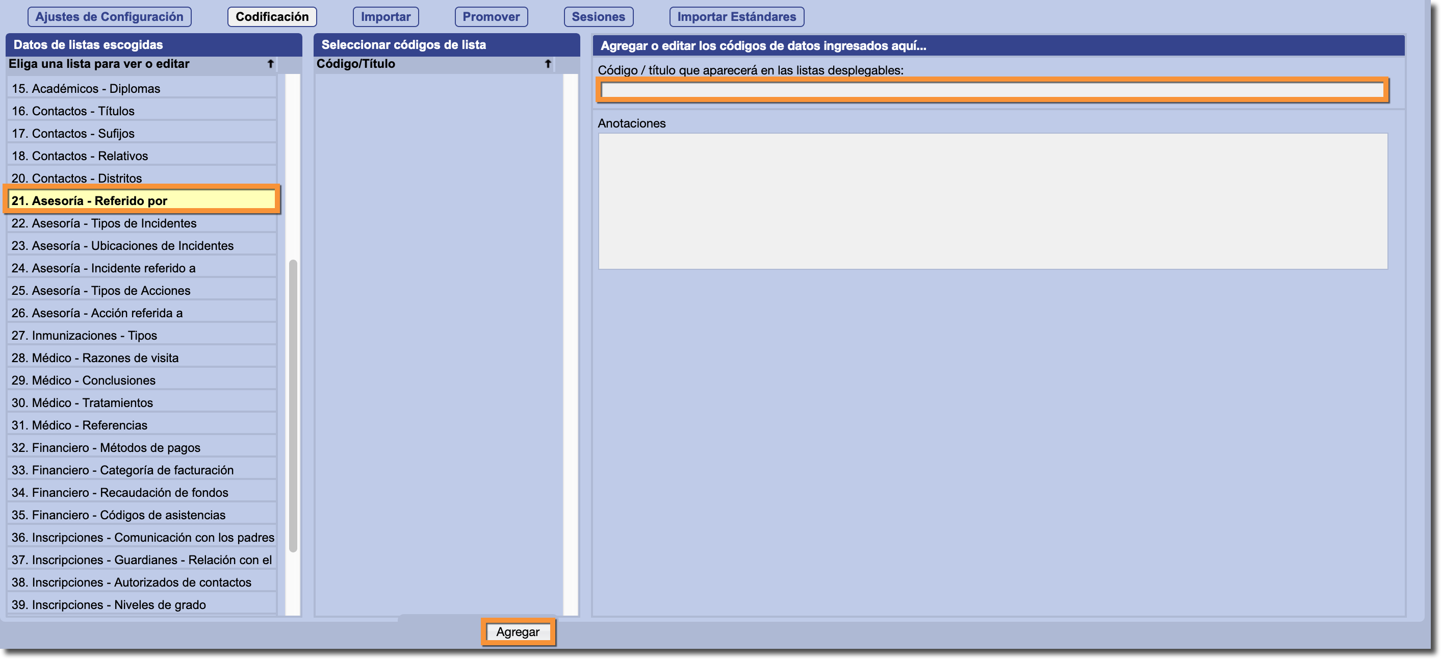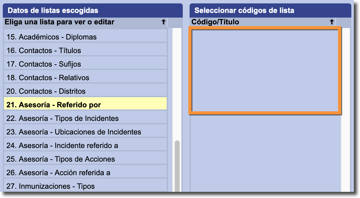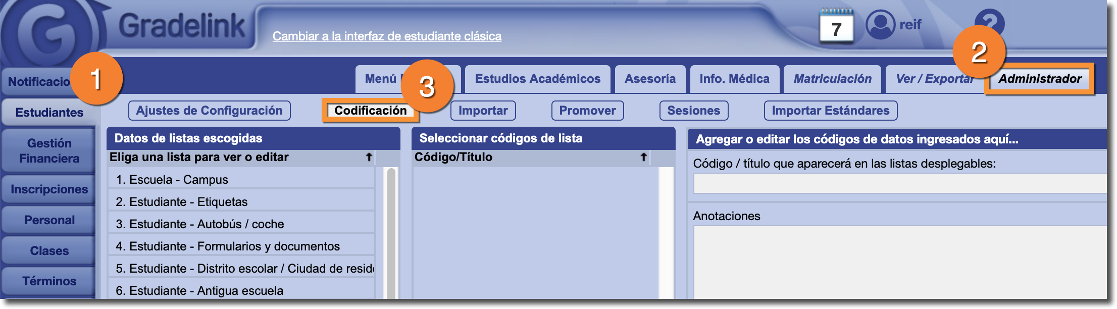 Nota: Es posible que algunas de las listas de codificación estén en blanco al seleccionarlas. Sin embargo, este no significa que la lista esté vacía. Si un menú de codificación aparece en blanco, eso significa que Gradelink está utilizando los valores predeterminados. Tan pronto como empieces a agregar nuevos valores, aparecerán normalmente.