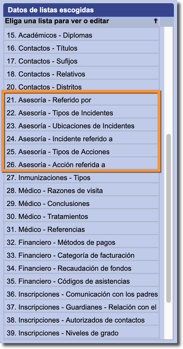 Hay seis categorías, todas que comienzan con la palabra "Asesoría", que corresponden a los menús desplegables que se encuentran en la sección Asesoría: